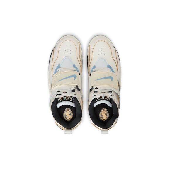 The Air Diamond Turf takes Deion Sanders's signature cross trainer and gives it a street-ready refresh. This version features durable leather, Nike Air cushioning and a midfoot strap for a secure fit. Sail/Mica Blue-Coconut Milk-Off Noir sneakers Leather upper ages to soft perfection. Nike Air units in the heel and forefoot provide cushioning with every step. Rubber outsole adds traction and durability. SKU: IF2534-100